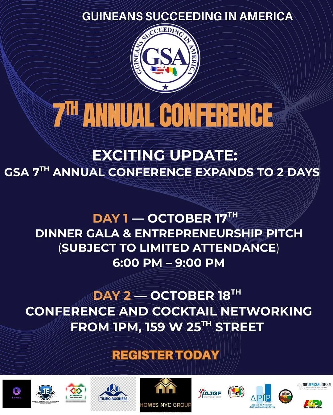 Guineans Succeeding in America (GSA) will host its 7th Annual Networking Conference in New York City on Saturday, October 18, 2025, from 1:00 p.m. to 6:00 p.m. Themed “Navigating New Frontiers: Building Resilience, Embracing Innovation,” the conference will bring together Guinean professionals, students, entrepreneurs, and community leaders for a powerful day of connection, inspiration, and forward-looking dialogue.